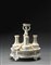 Set da condimento costituito da oliera in terraglia color crema con alta base traforata sostenuta da quattro piedini; presa centrale sormontata da una piccola statuetta raffigurante un putto che sorregge un cesto di vimini ; dal centro dipartono quattro rami terminanti a foglia aperta e concava. Quattro ampolle a corpo cilindrico e collo lungo con bocca estroflessa. Area veneto romagnola sec XIX (estesi restauri) 19th-century table set comprising an earthenware cruet stand with four jugs (restorations)