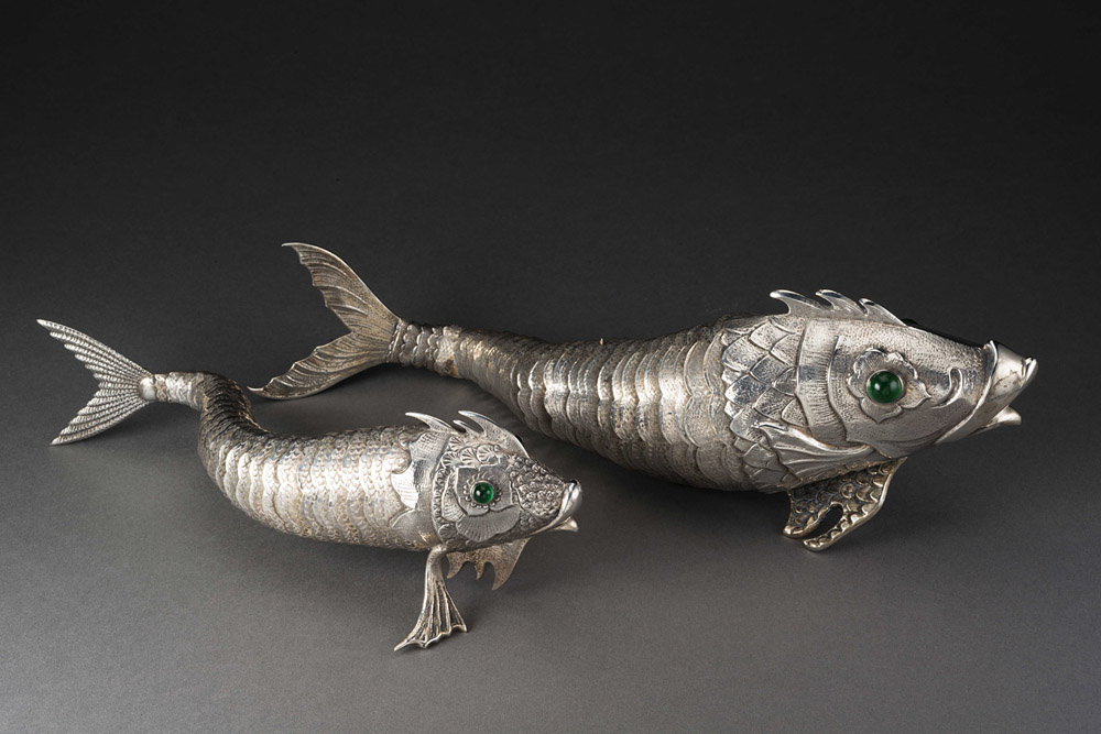 Lotto composto da due pesci con corpo segmentato snodabile in argento con...