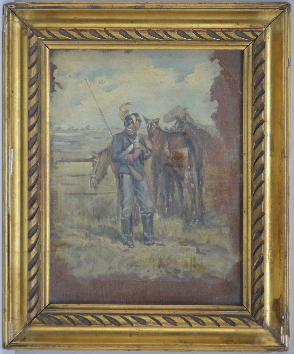 Anonimo "La sosta" bozzetto olio su tavoletta (cm 27.5x21.3) In cornice (Difetti) "The stop" oil sketch on tablet. Framed (defects)