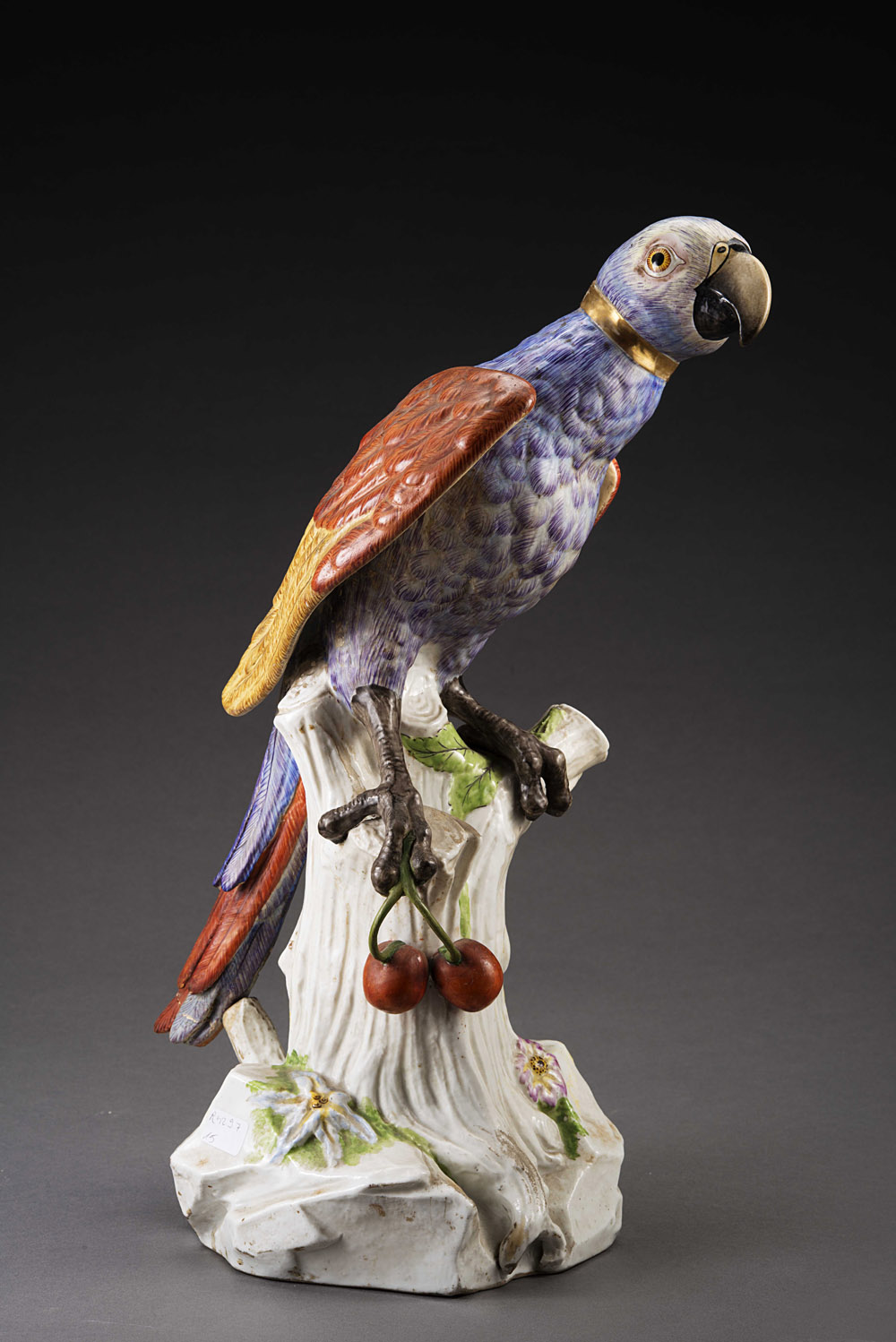Manifattura Samson ad imitare Meissen, sec. XIX Figura di pappagallo in porcellana policroma poggiante su tronco d'albero (cm 43) (difetti e rotture) 19th-century porcelain figure of parrot