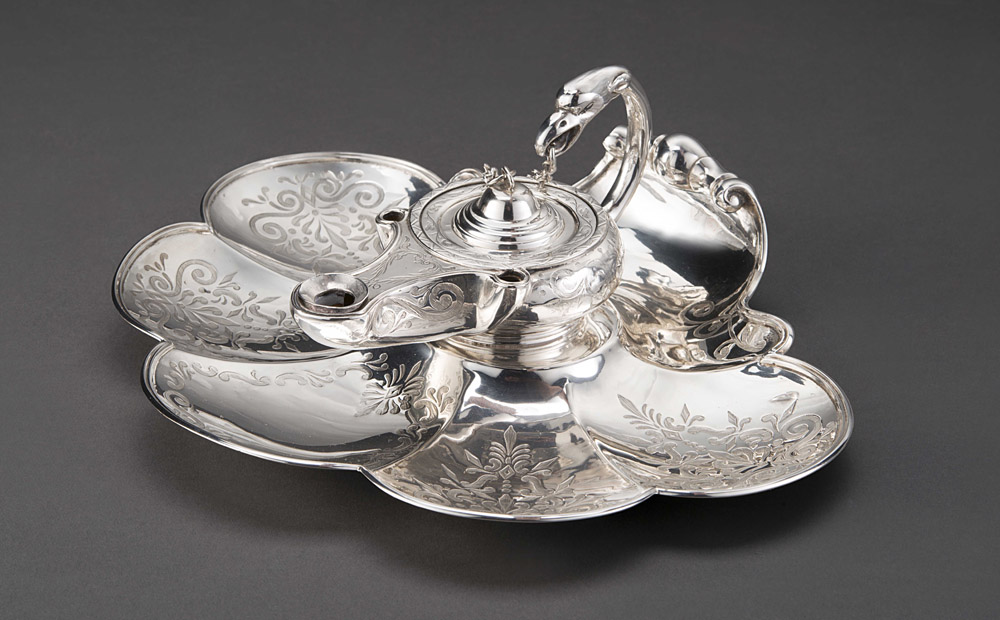 Bugia in argento cesellato a motivi vegetali con presa a forma di testa di...