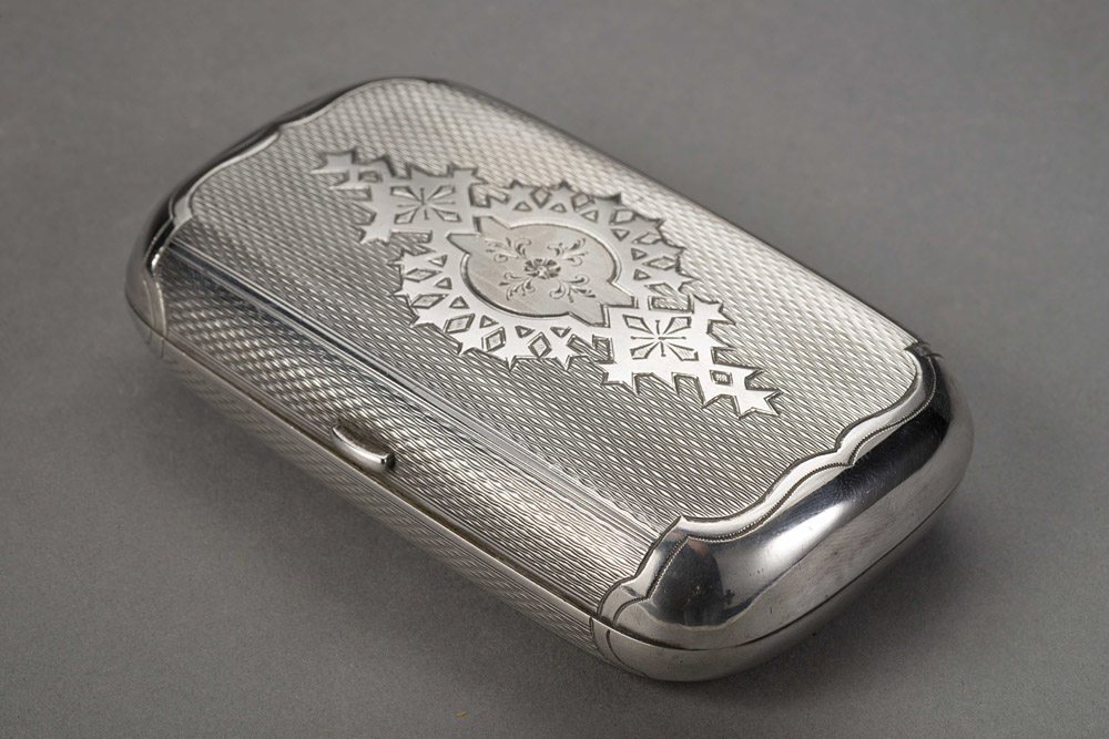 Tabacchiera in argento zigrinato e inciso a motivi geometrici . Mosca fine XIX secolo (lievi difetti) Late 19th-century Russian silver snuff-box (minor defects)