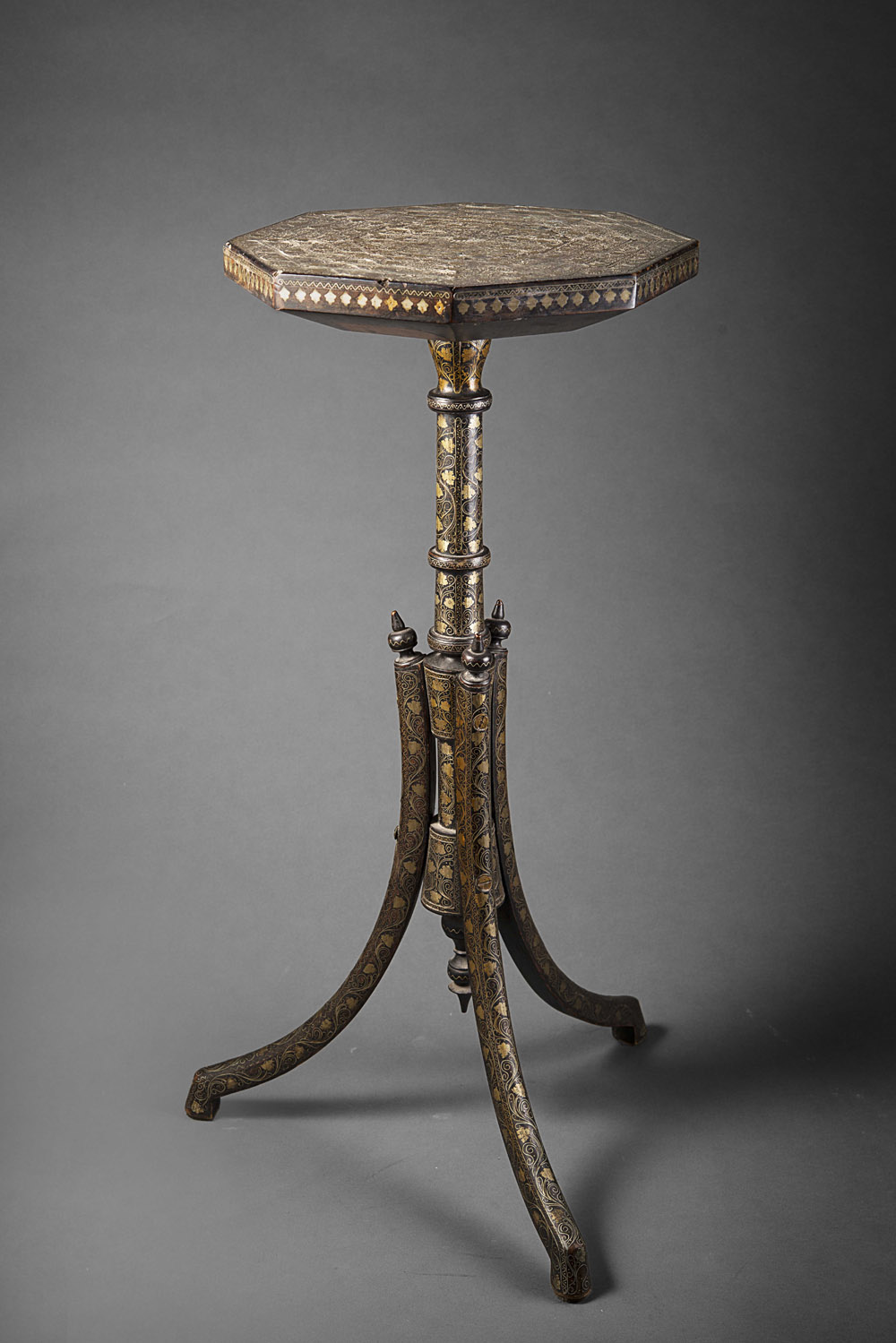 Tavolino tripode con piano di forma ottagonale con gamba centrale tornita terminante a tre piedi sagomati. Corpo interamente intarsiato in metallo a volute e foglie di vite. India inizio sec. XX. Traccia di etichetta sottopiano (h cm 64,5) (lievi difetti) Early 20th-century octagonal three-foot Indian table (minor defects)