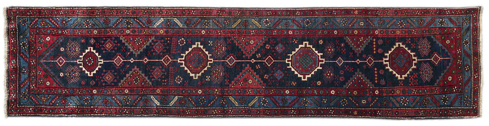 Passatoia Hamadan , Persia prima metà del sec. XX , campo blu decorato con quattro medaglioni nei toni del rosso , azzurro e bianco (cm 388x90)( difetti ) First half of the 20th-century. Persian Hamadan hall carpet (defects)