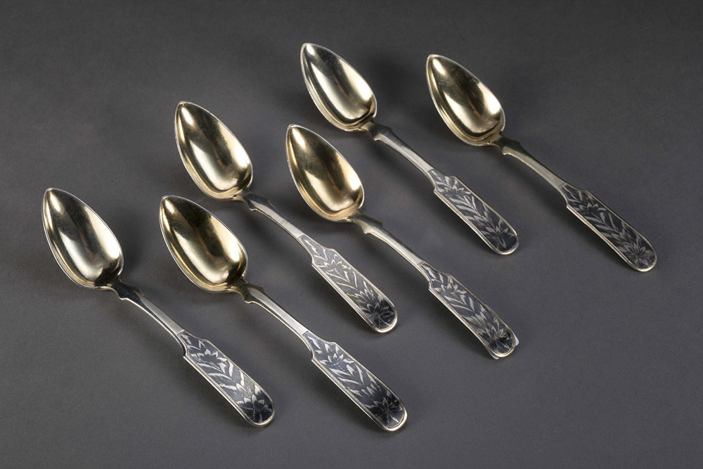 Gruppo di sei cucchiaini in argento niellati e dorati.Punzoni di Mosca, 1834 Group of six silver tea-spoons