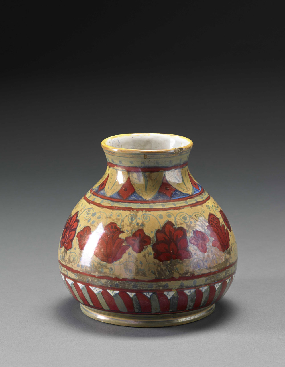 Vaso in maiolica di forma globulare con bocca estroflessa. Decorazione a lustro di gusto rinascimentale. Sul retro marca di fabbrica in blu. Gubbio sec XX (h cm 17,5) 20th-century majolica vase