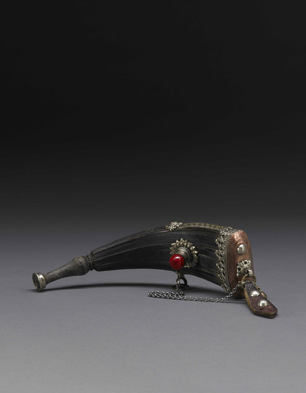 Contenitore per polvere sparo in corno di bufalo con finiture in argento lavorato e pietra dura di colore rosso Cina, XIX/XX secolo A buffalo horn gun powder holder with silver mounts and inset with hardstones China, 19th/20th century (l max. cm 23)