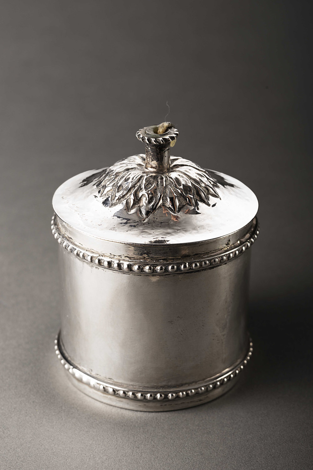 Stoppiniera in argento a corpo liscio con coperchio sbalzato a volute.Punzoni di Venezia, sec. XIX (difetti) 19th-century Venetian tea-light (defects)
