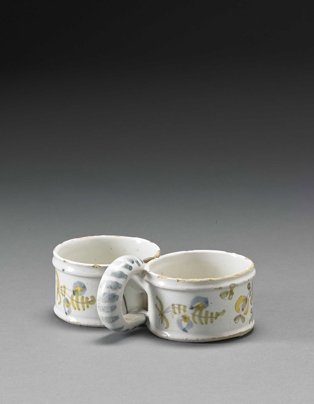 Lotto 708 | Oliera in maiolica in policromia blu e verde con decoro a ghirlanda vegetale....