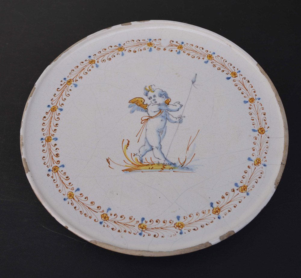 Lotto 712 | Alzata in maiolica a decorazione compendiaria con putto al centro. Area...