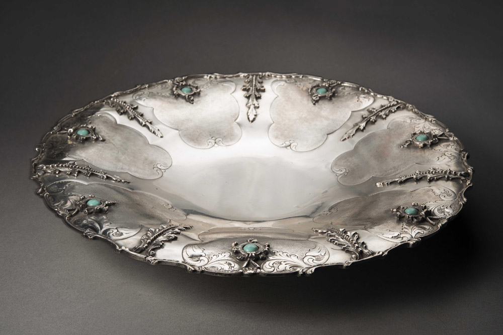 Centrotavola in argento di forma circolare poggiante su tre piedi a sfera, decorato a riserve zigrinate e applicazioni a motivi vegetali alternati a pietre dure. Italia, XX secolo (d. cm 35) 20th-century silver centrepiece