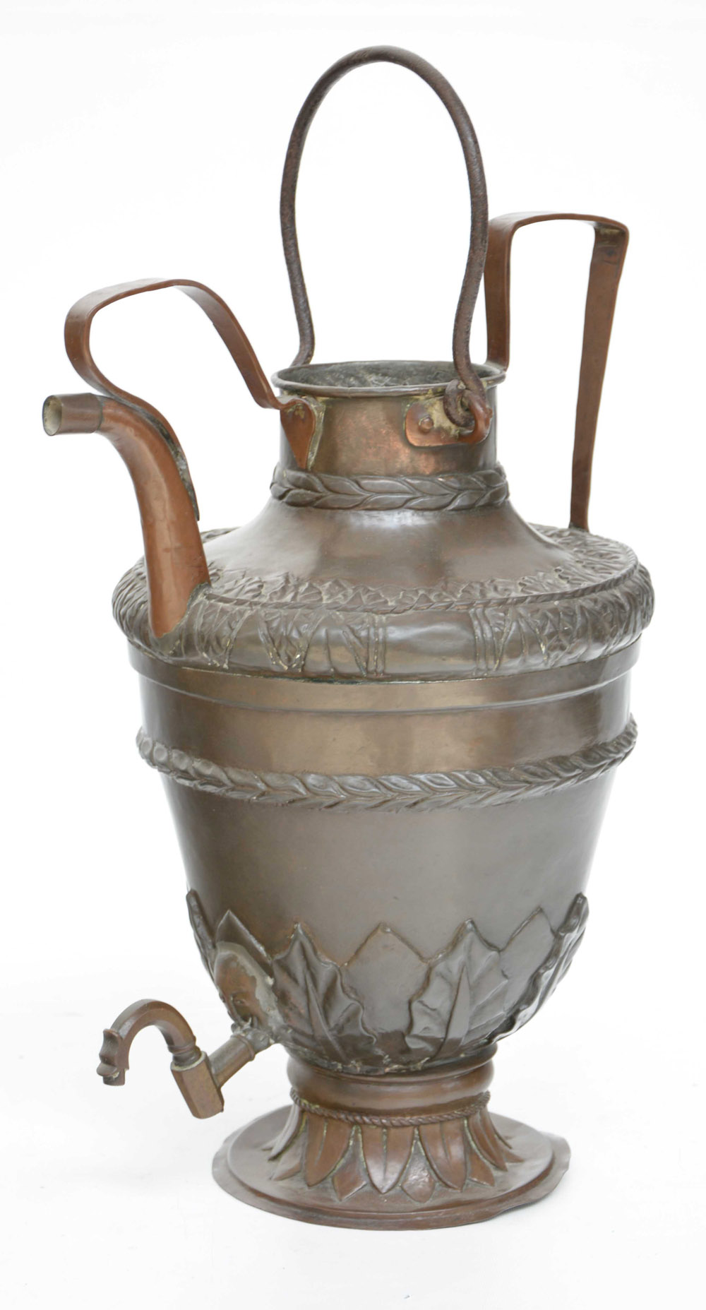 Acquamanile in rame con corpo sbalzato a foglie d'acanto. Prese e rubinetti...