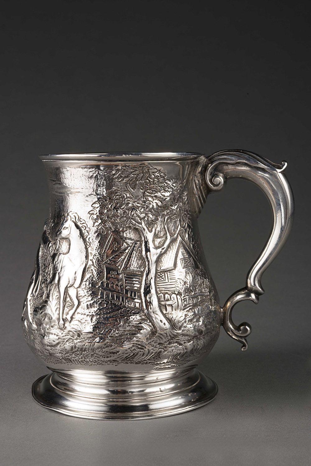 Boccale in argento a corpo sbalzato in epoca vittoriana con scena di vita rurale. Argentiere Thomas Farren. Londra, 1765 (h cm 12) (gr 350) (difetti) Silver mug (defects)
