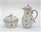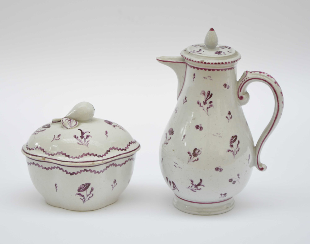 Piccola caffettiera (h cm 18) e zuccheriera (h 9x13x10) in porcellana bianca con decoro a fiori sparsi in rosso porpora. Ginori sec. XVIII/XIX (difetti) Small 18th/19th-century white porcelain coffee pot and sugar bowl (defects)