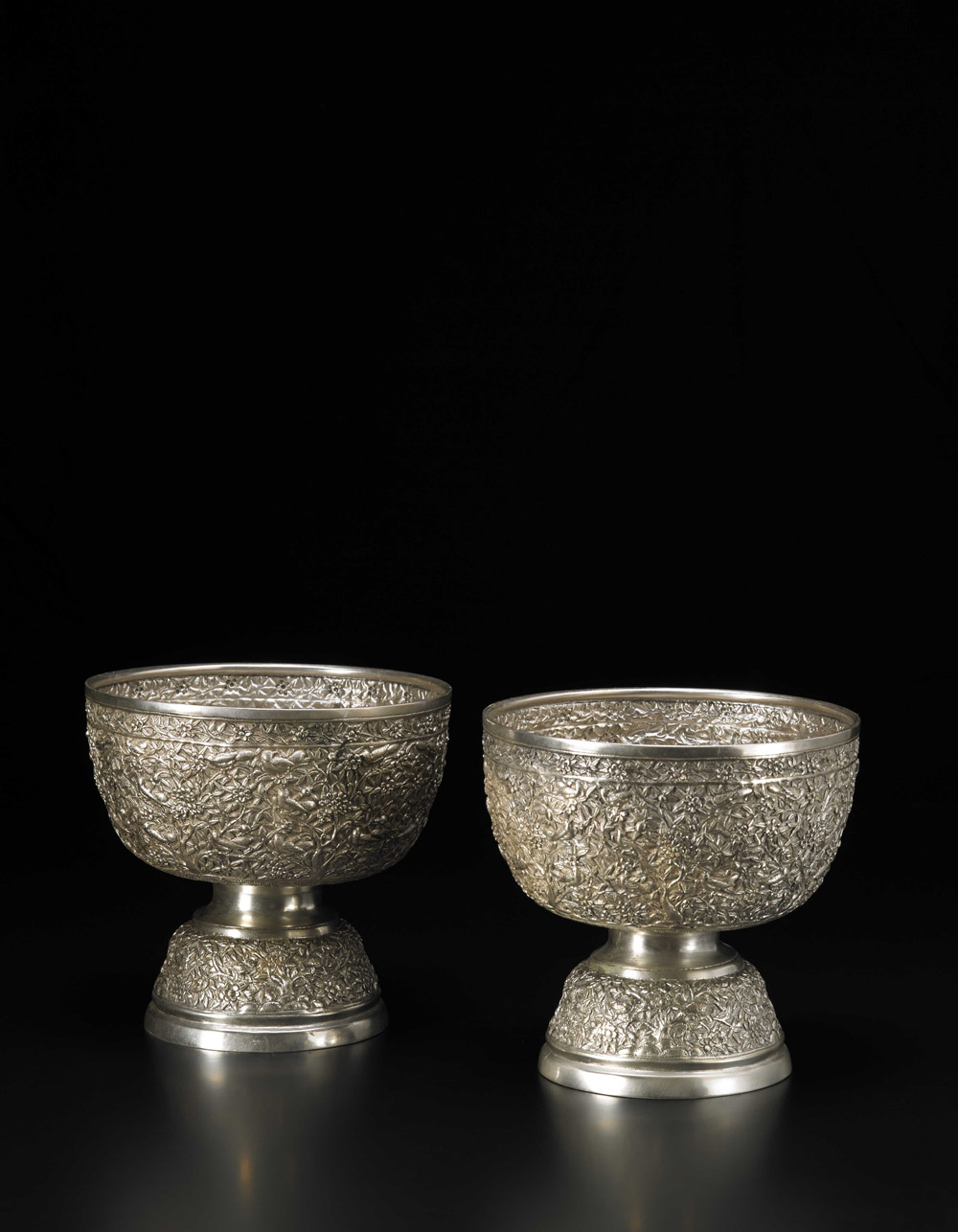 Coppia di coppe in argento finemente cesellate a motivi floreali Cambogia,...
