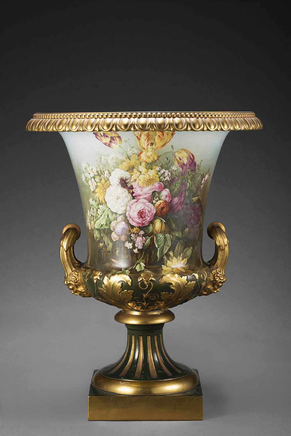Lotto 744 | Vaso "mediceo" in porcellana con foggia a cratere con bordura a rilievo a...