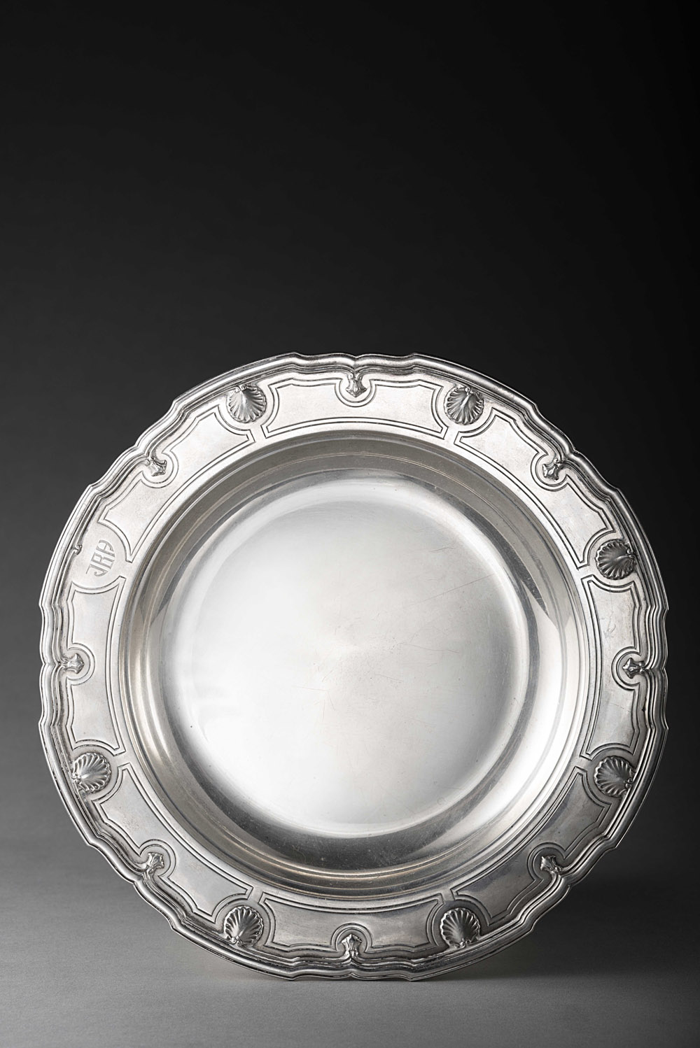 Piatto tondo in argento decorato nel bordo a valve di conchiglie e cifre....