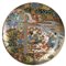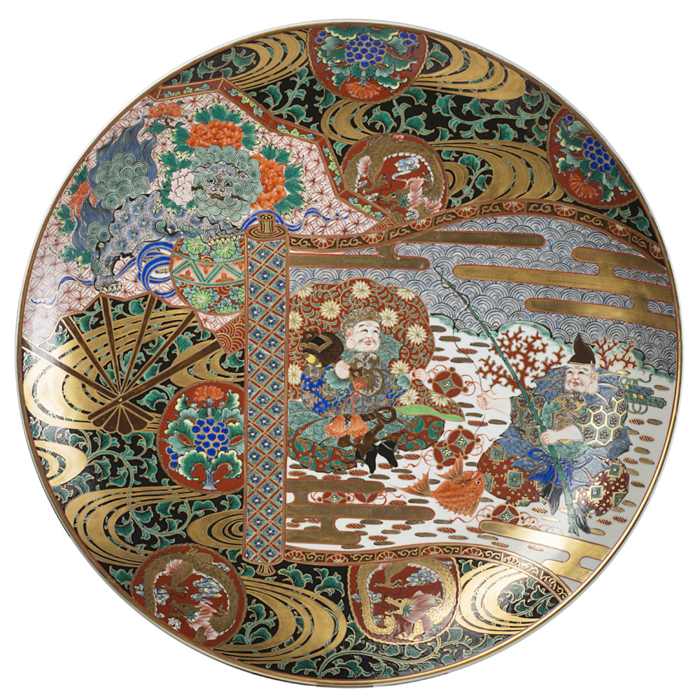 Grande piatto in porcellana decorato in policromia e doratura, con due figure all'interno di un cartiglio contornato da vari oggetti e motivi geometrici Giappone, periodo Meiji (1868-1912) (diam. cm 55) Large late 19th-century Japanese Imari porcelain dish