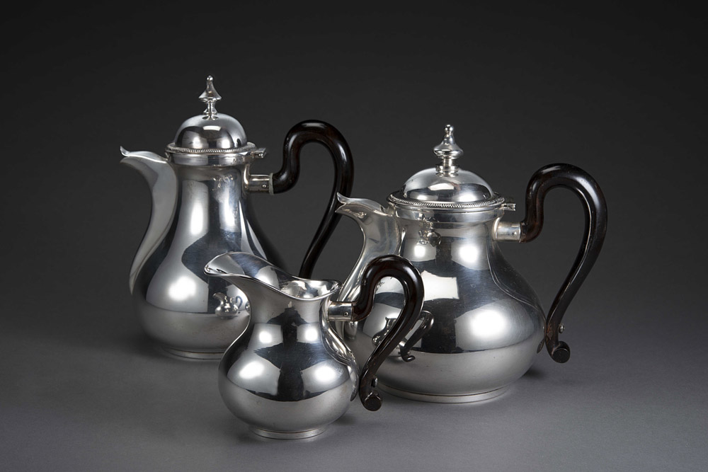 Servizio da tè e caffè in argento a corpo piriforme , con pomoli a forma di puntale e prese in legno ebanizzato composto da: lattiera, teiera, caffettiera. Argentiere Miracoli(gr 1200 lordi) (difetti) Silver tea and coffee set (defects)