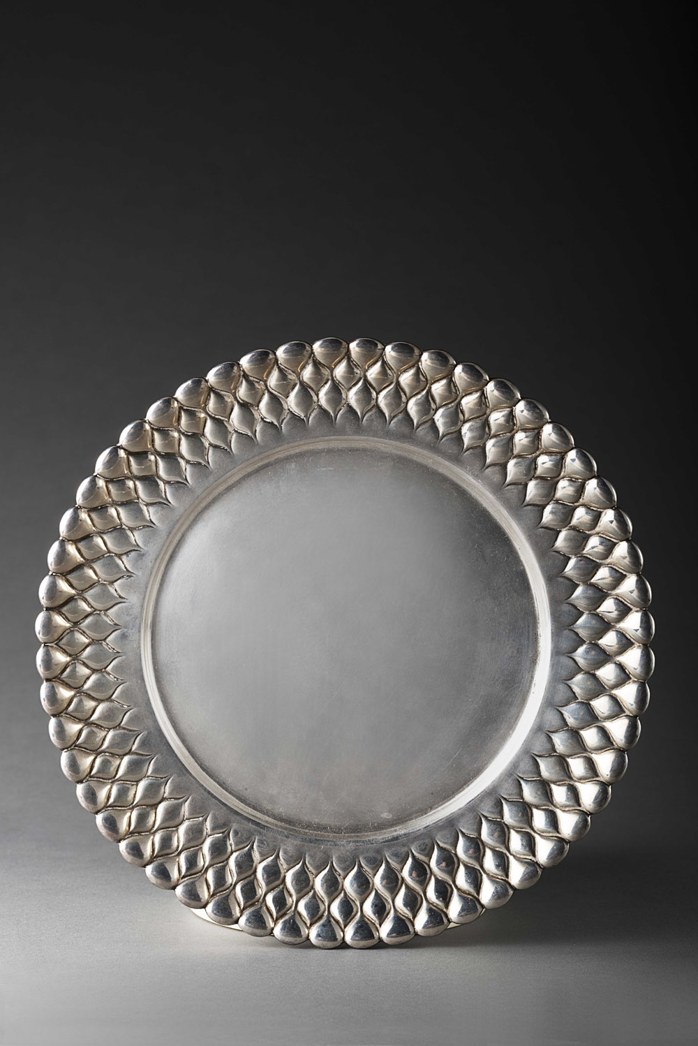Piatto di forma tonda in argento decorato nel bordo a motivi geometrici....