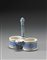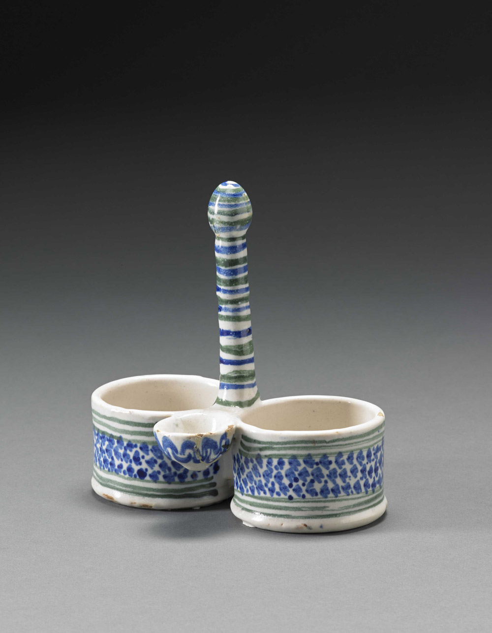 Oliera da tavola in maiolica con decoro in blu e verde a piccole foglie stilizzate. Presa verticale cilindrica terminante con presa ovoidale. Tra i due porta ampolle una piccola saliera a forma di coppa concava. Sec XIX (h cm 20x17x9) (mancante delle ampolle, sbeccature) 19th-century majolica cruet stand (missing jugs. Chipped)