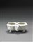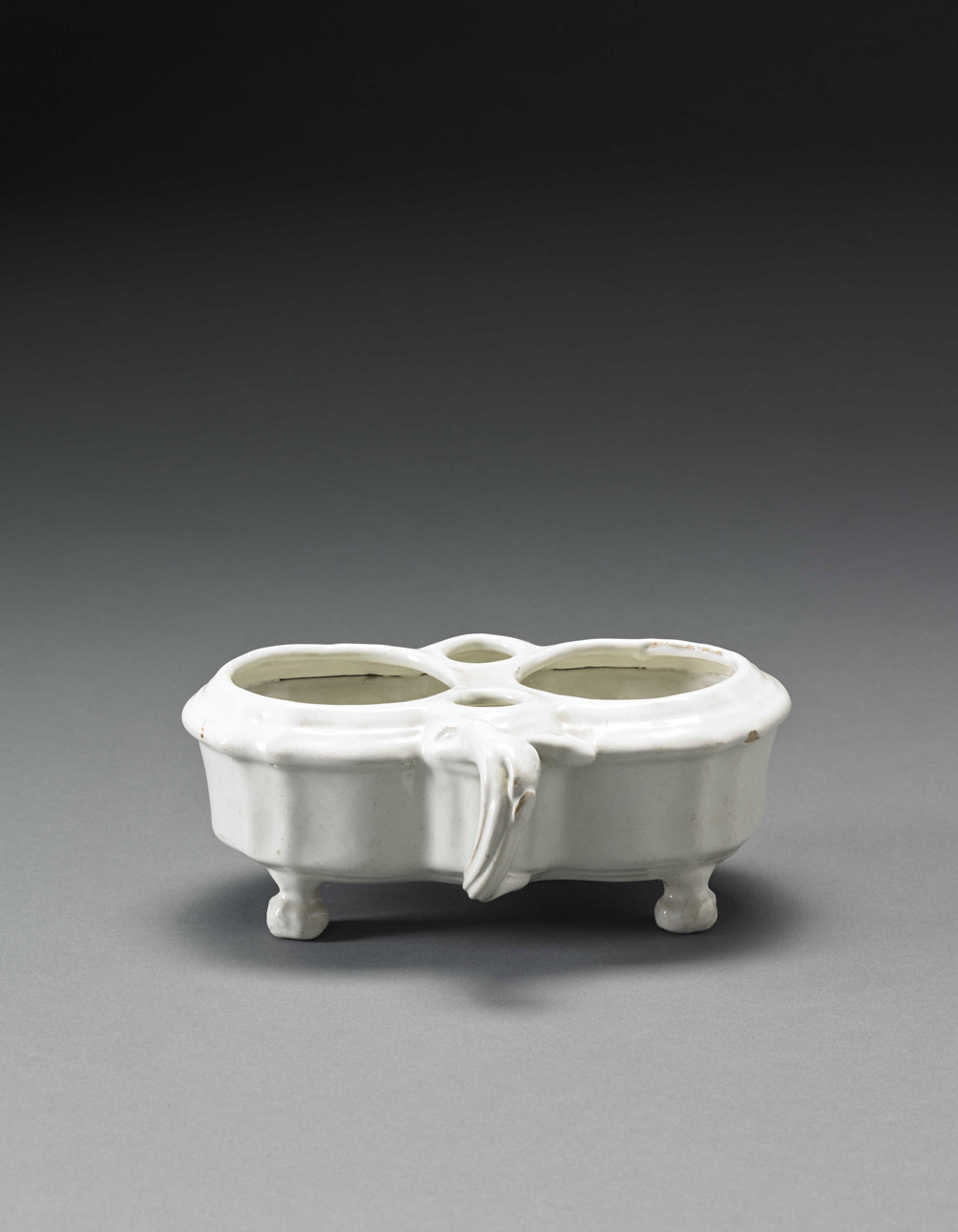 Servizio da scrittoio in maiolica bianca con corpo sagomato e costolato poggiante su quattro piedini. Due prese simmetriche a ricciolo. Sec XVIII.(cm 22x16,5) (mancante dei contenitori, sbeccature) 18th-century white majolica writing set (missing containers. Chipped)