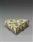 Calamaio triangolare in maiolica a tre vaschette tonde. Decorazione in verde e giallo. Sui lati mascheroni centrali Spagna sec XVIII(cm 15x15) (sbeccature) 18th-century Spanish triangular majolica inkpot (chipped)