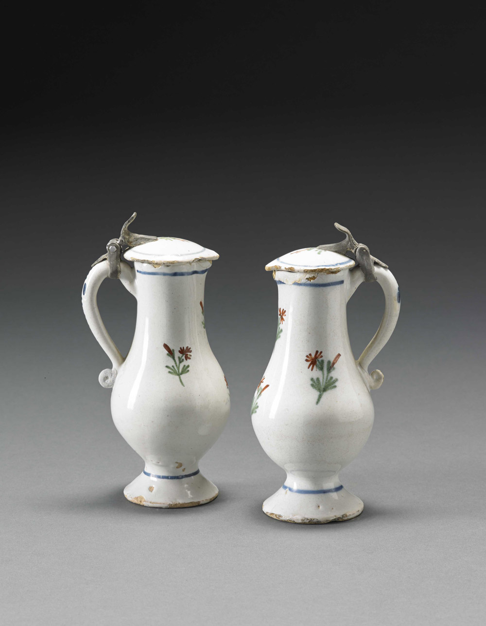 Oliera da tavola in maiolica con decoro policromo a piccoli fiori sparsi. Ampolle con cerniere del coperchio in peltro. Presa ad anello. Sec XIX (h cm 15x18x8) (Sbeccature) 19th-century majolica cruet stand (chipped)
