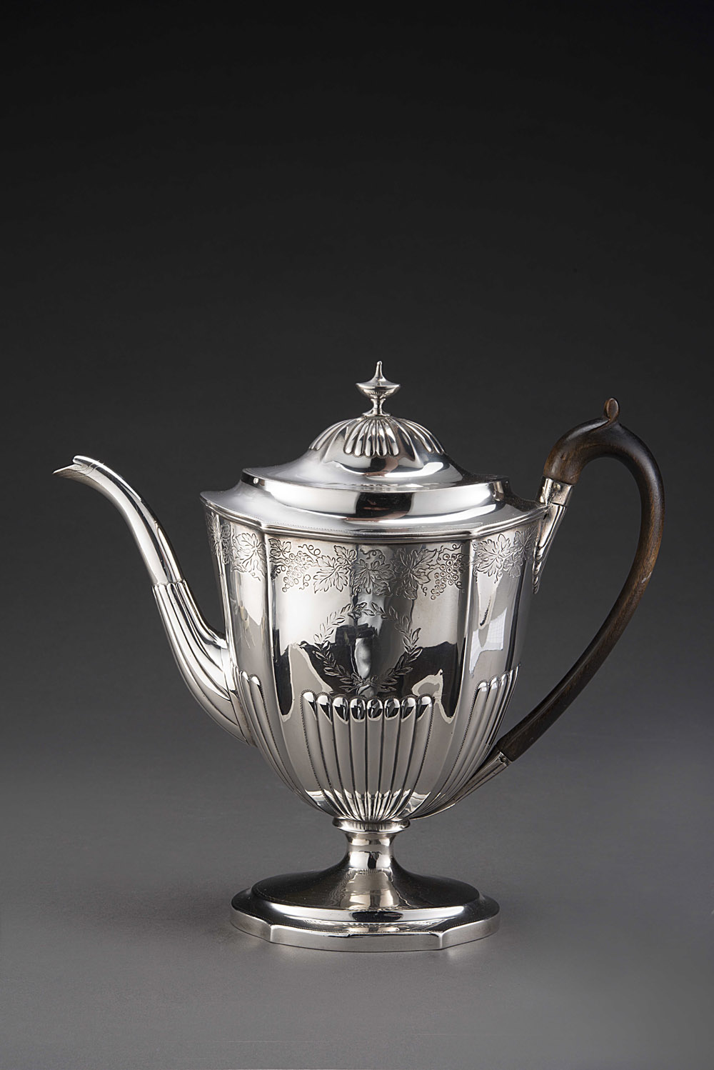 Caffettiera in argento con corpo e coperchio costolato, base sagomata, manico in legno. Punzoni di Londra 1800. Fascia superiore incisa in epoca vittoriana a tralci di vite con uva (gr 850 lordi) Silver coffee pot with wooden handle