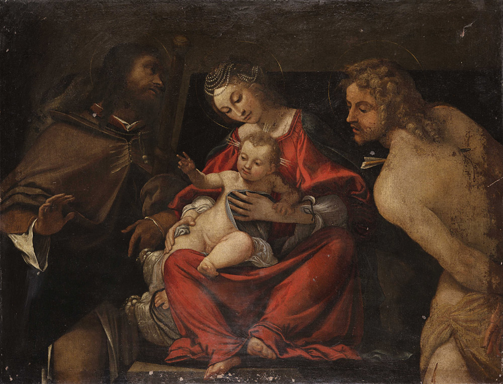 Maestro dell'Italia centrale fine del XVII secolo "Madonna con Bambino, San Rocco e San Sebastiano" olio su tela (cm 111x85,5)In cornice (difetti) Provenienza Coll. Conti Contini Bonaccossi di Firenze Late 17th-century Italian master "Madonna with Child, St. Rocco and St. Sebastian" oil on canvas. Framed (defects)
