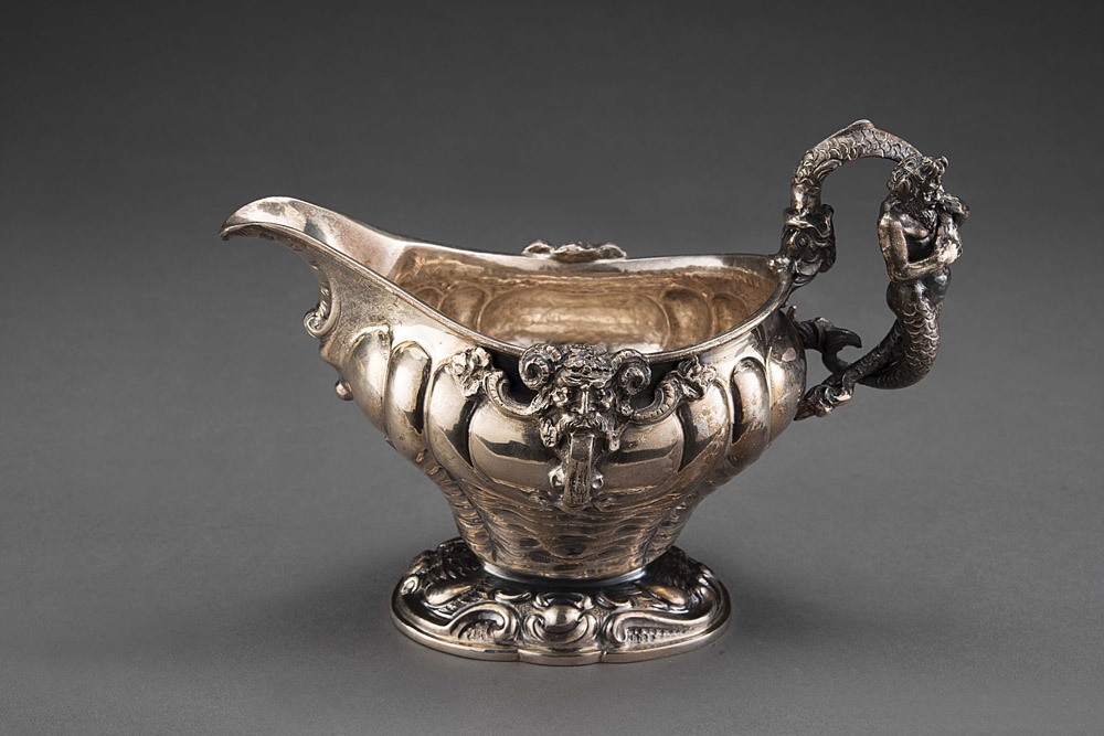 Versatoio in argento con corpo sbalzato a motivi stilizzati e decorato con...