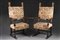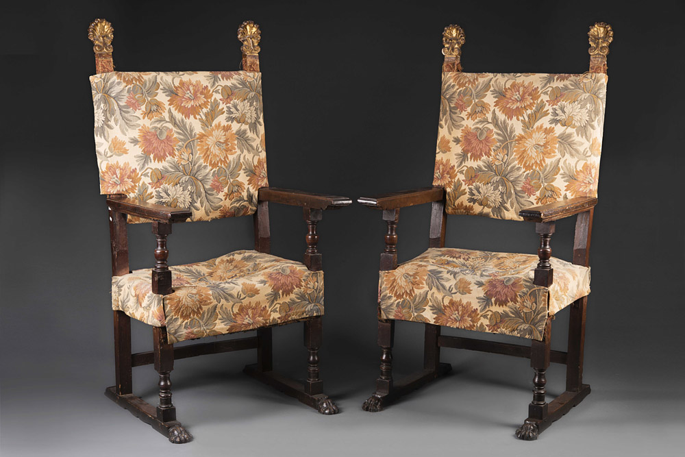 Coppia di poltrone con puntali in legno intagliato e dorato a volute fogliate. Gambe con montanti torniti e terminanti a piedi fierini. Rivestite in tessuto antico decorato a fiori e motivi vegetali. Sec XVII Pair of 17th-century armchairs
