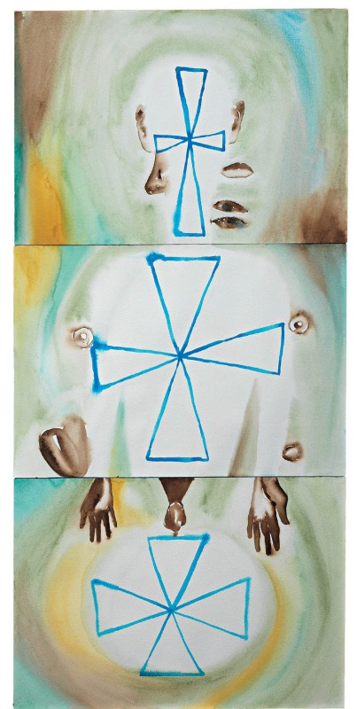 Francesco Clemente Napoli 1952 Men and Women n. 12, 1985-90 Acquerello su cartone, cm. 108x50,7 (tre fogli di cm. 36x50,7 ognuno) Al verso, su un pannello di supporto: etichetta Baudoin Lebon, Paris, con n. BL 14580: etichetta Galerie Jerome de Noiermont - Paris, con n. FC 00001. Storia: Akira Ikeda Gallery, Tokio; Galerie Bellier, Parigi; Baudoin Lebon, Parigi; Galerie Jerome de Noiermont, Parigi; Collezione privata L'autenticità dell'opera è stata confermata verbalmente dallo Studio Clemente, New York (vedi Christie's, Milano, 24 maggio 2011, n. 63).