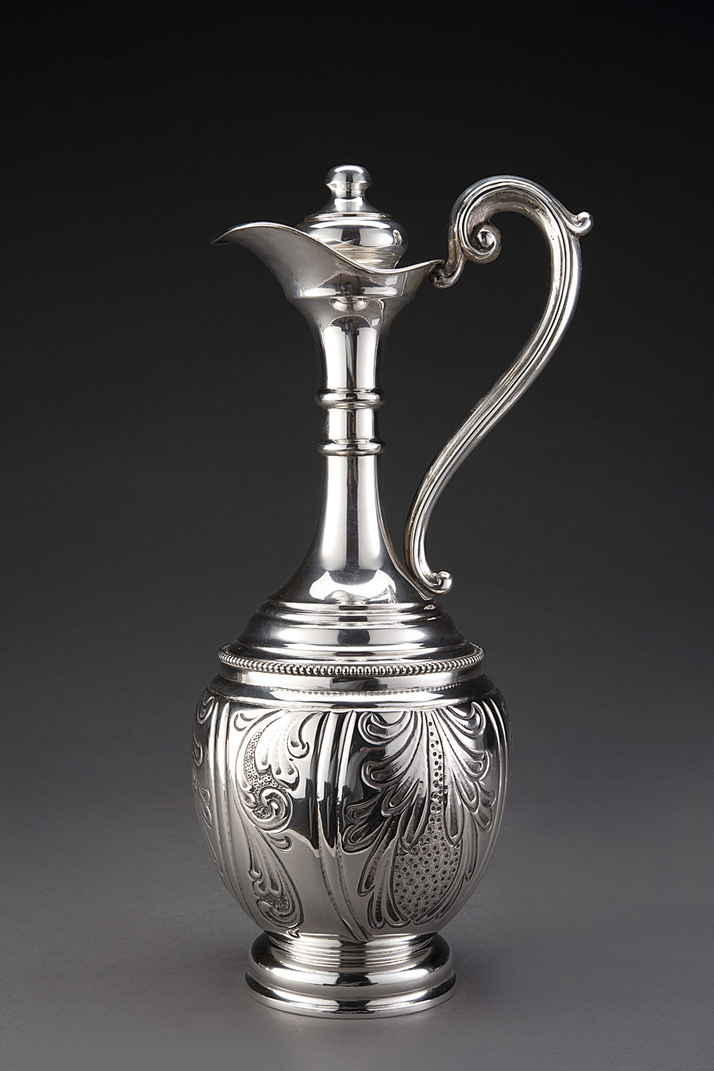Acquamanile in argento cesellato a motivi vegetali con manico sagomato. Tappo...