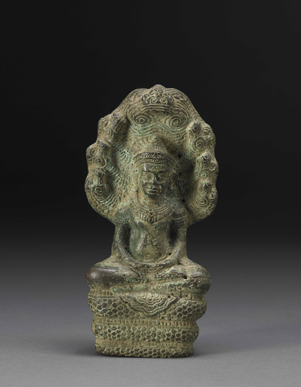 Divinità in bronzo seduta a gambe incrociate su un serpente a spirale, le mani giunte Cambogia, XVI secolo o più tardo A bronze deity, depicted seated cross-legged on a spiralling snake, with conjoined hands Cambodia, 18th/19th century (h cm 37)