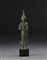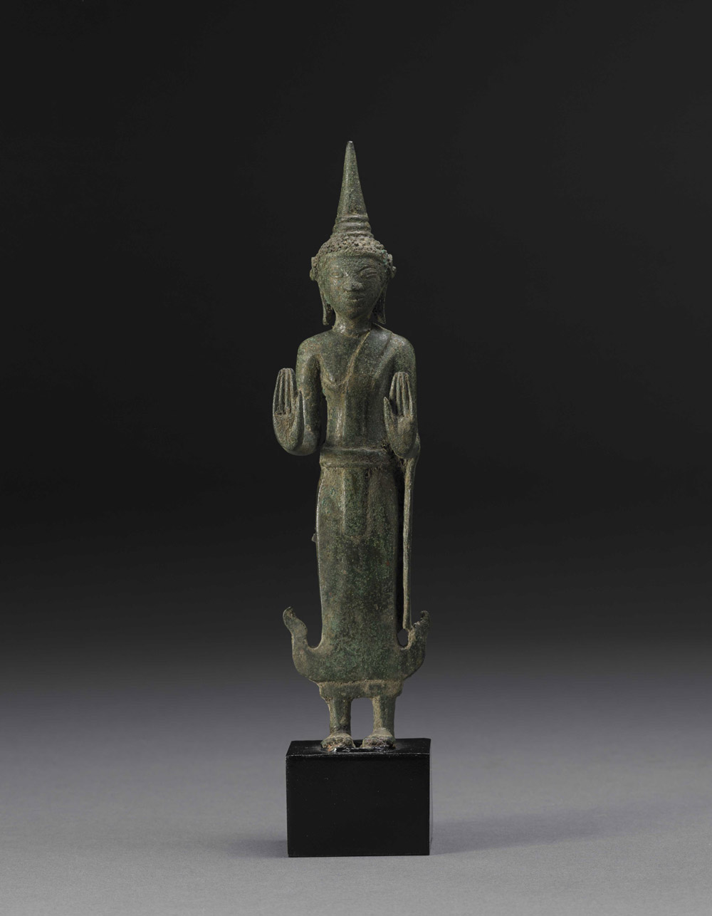 Buddha in bronzo raffigurato in piedi, il volto con espressione sorridente e con orecchie dai lunghi lobi, le mani nella classica postura del "non temere", con lunghe vesti che coprono il corpo lasciando i piedi scoperti Cambogia, sec. XV A standing bronze Buddha, a serene facial expression, with long-lobed ears, the hands in the classic fear-not gesture, the long robes leaving the feet uncovered Cambodia, 15th century (h cm 22)