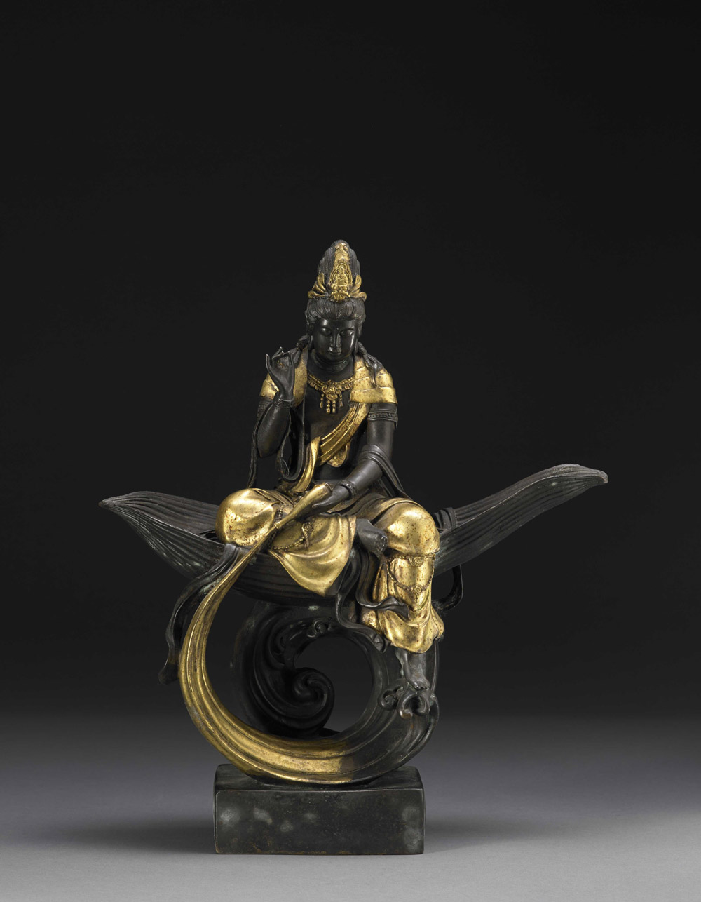 Bodhisattva Avalokitesvara in bronzo raffigurato seduto con una gamba piegata, il volto sereno sormontato da una corona, le vesti dorate si aprono sul petto adornato con gioielli, la mano sinistra con un piccolo il cui contenuto versato forma un'onda ai piedi della divinità Vietnam, sec. XX A bronze Bodhisattva Avalokitesvara seated with a bent leg, the face with serene expression surmounted by a crown, the gilt robes revelaing a chest adorned with beaded jewellery, the left hand with a vessel pouring water creating an elegant wave Vietnam, 20th century (h cm 35)