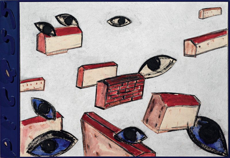 Enzo Cucchi Morro d'Alba (An) 1949 Senza titolo (The age of Jesus), 1996 Tecnica mista e collage su carta applicata su tavola in cornice di metallo dipinto, cm. 76x110 (con cornice) Data e firma al verso sulla tavola: 1996 / Enzo Cucchi: etichetta Akira Ikeda Gallery, Tokio, con n. (EC-60). Storia: Akira Ikeda Gallery, Tokio; Collezione privata