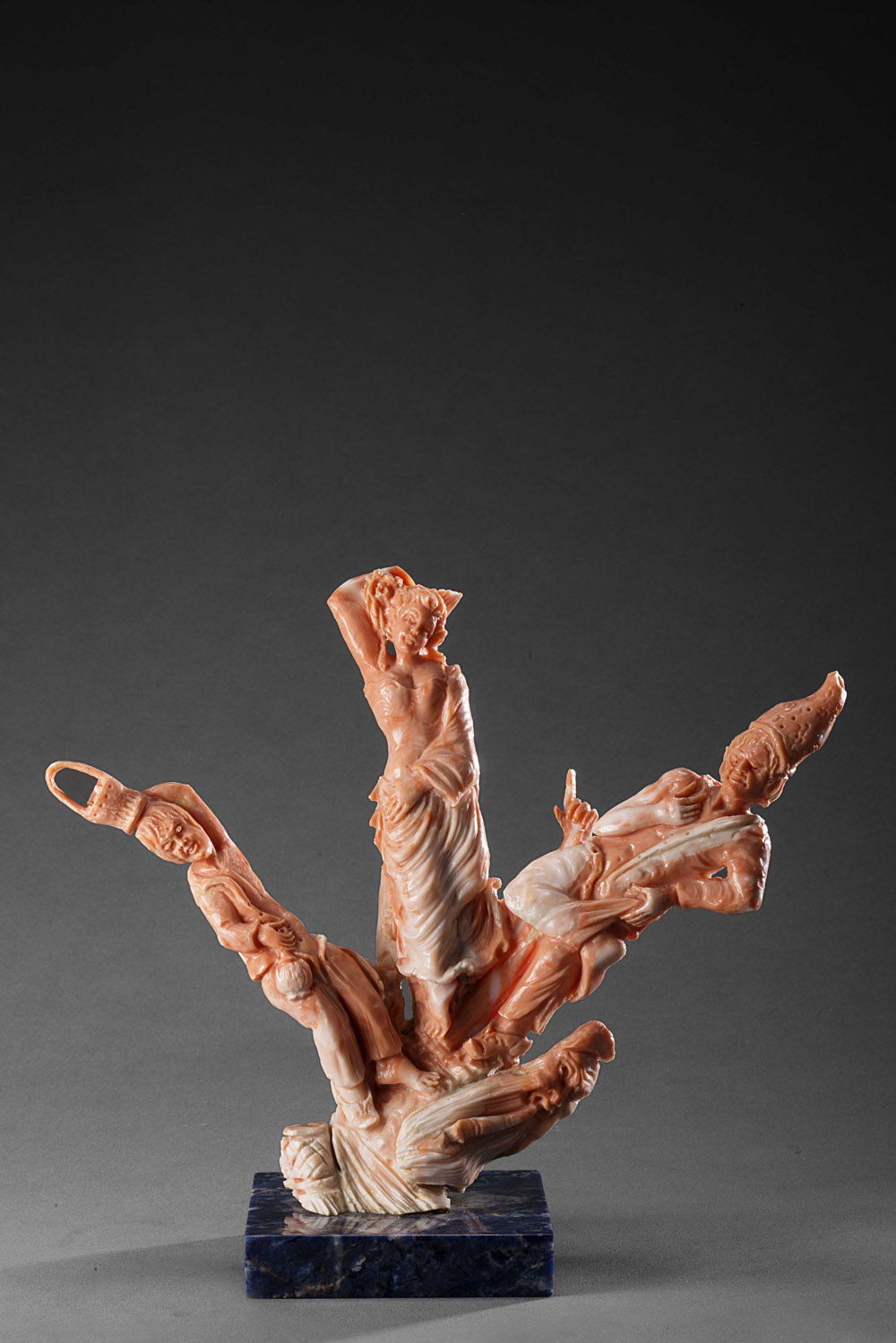Statua in corallo raffigurante personaggi allegorici. Sec. XX. Base in quarzo...