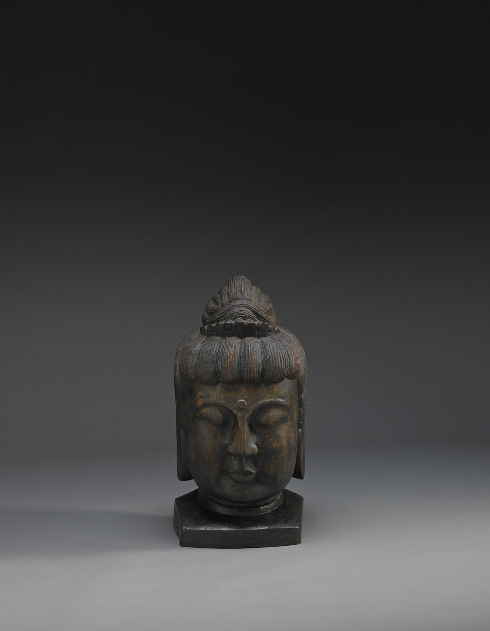 Testa in legno scolpito della divinità Kannon, con capelli tipicamente acconciati ed espressione del viso serena Giappone, XIX/XX secolo 19th/20th-century Japanese carved wood head (h cm 50)