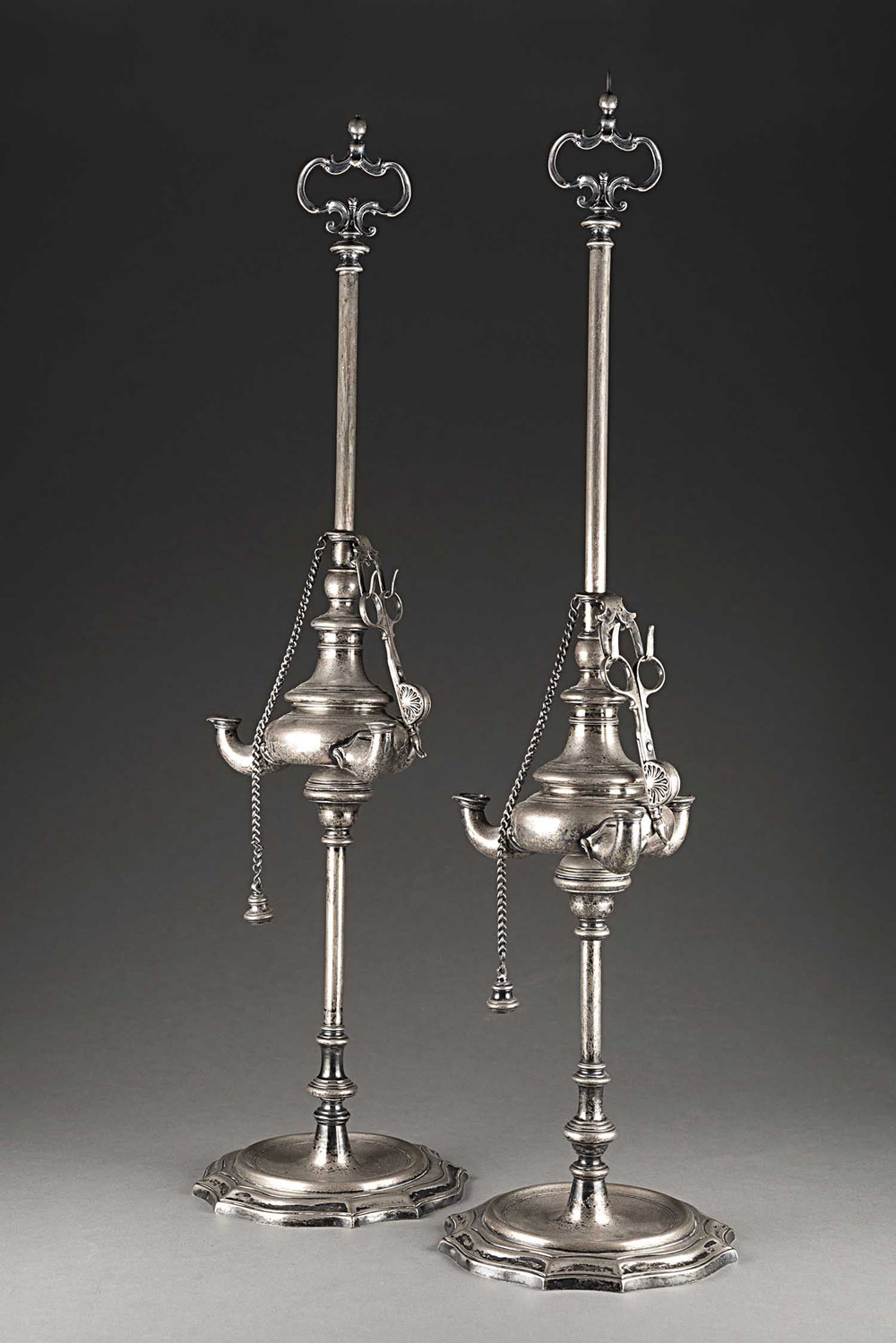 Coppia di lampade fiorentine in argento a corpo liscio su base cicolare gradinata, vaschetta con tre beccucci e accessori (gr.3700)(h.cm.70) A pair of florentine silver lamps