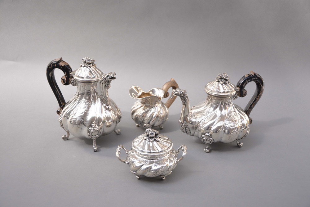 Servizio da caffè e tè in argento cesellato a volute composto da: teiera,...