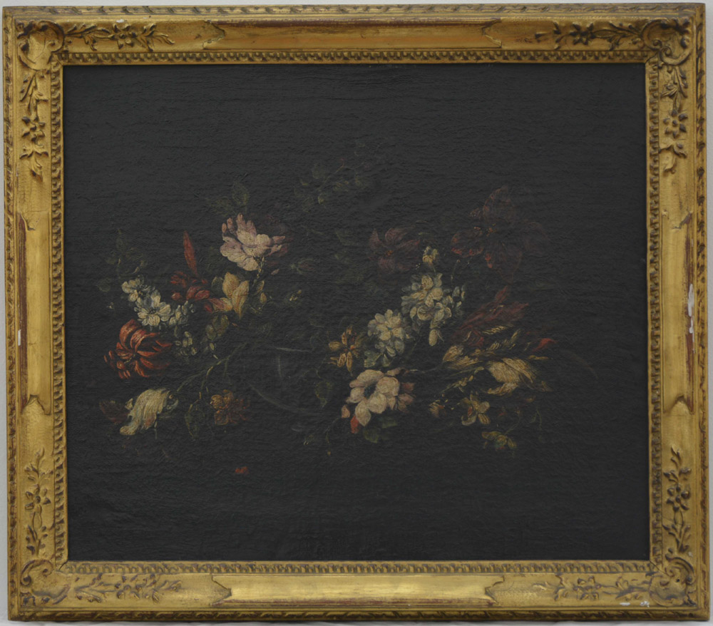 Maestro del sec. XVII 'Vaso fiorito' olio su tela (cm 97x56) in cornice dorata (restauri) 17th-century master "Blooming vase" oil on canvas (restorations)