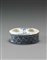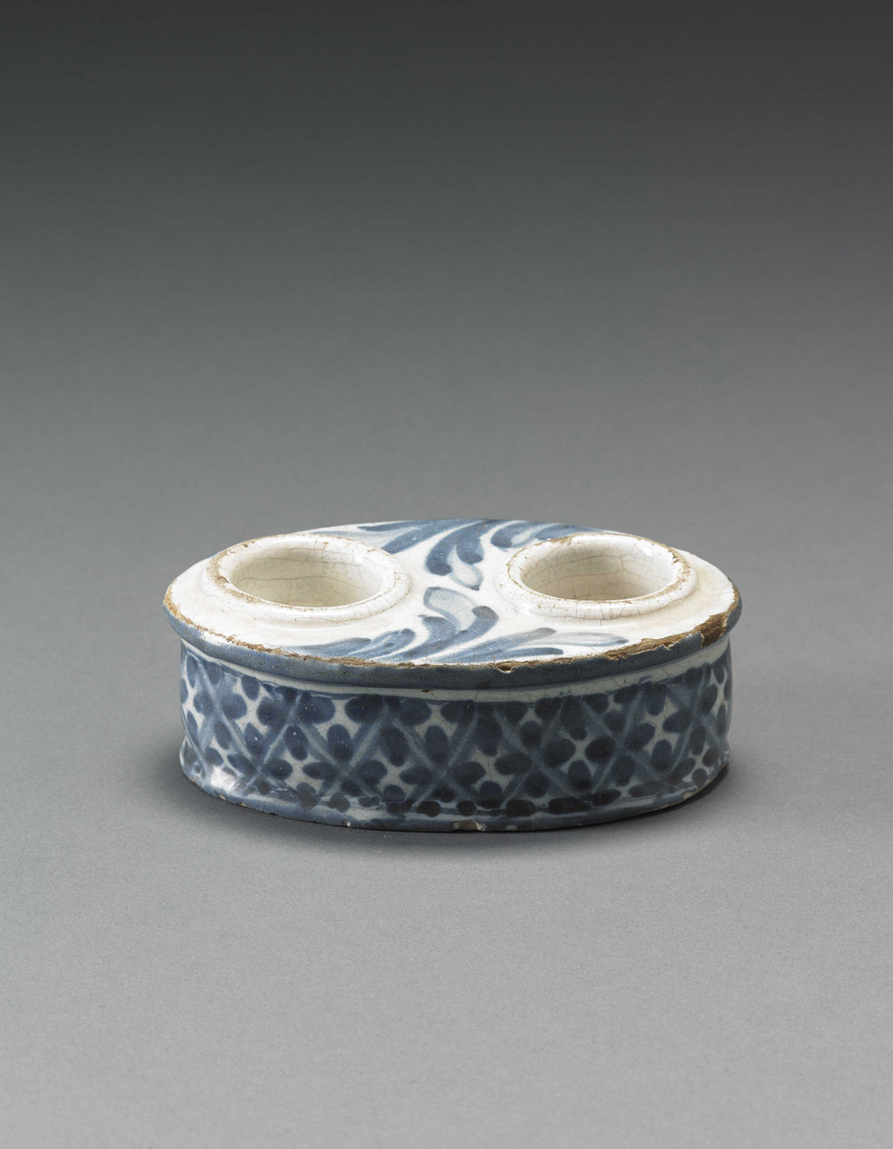 Calamaio ovale in maiolica con due vaschette portainchiostro tonde , decorazione in monocromia blu. Spagna sec XVIII (cm 14x9) (sbeccature) 18th-century Spanish oval majolica inkpot (chipped)