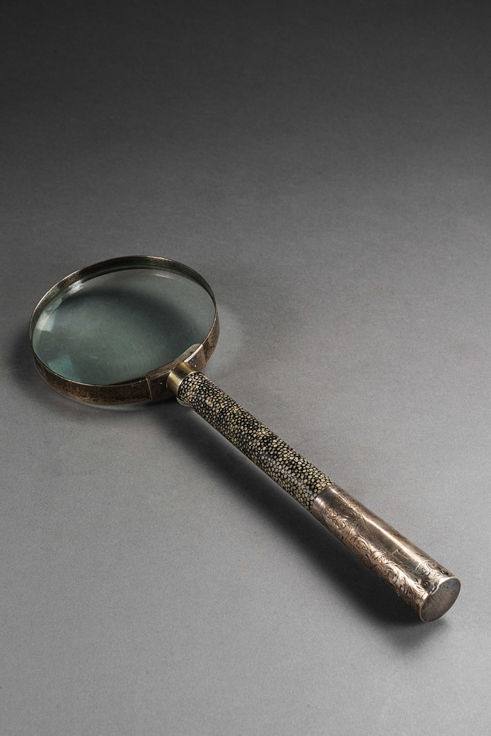 Lente di ingrandimento con manico in galuchat e presa in argento cesellato a...