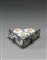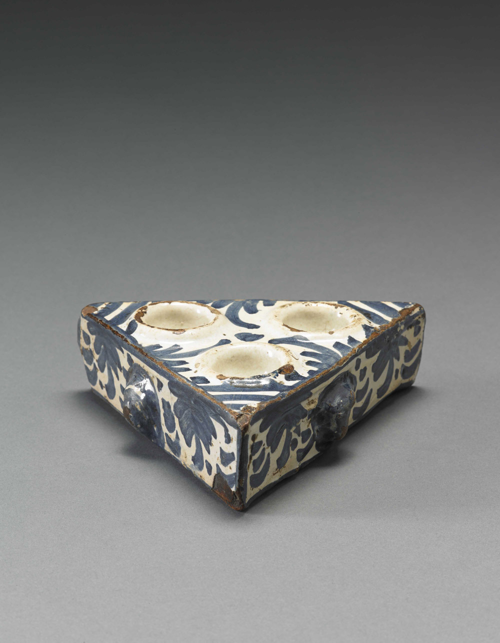 Calamaio triangolare in maiolica a tre vaschette portainchiostro tonde. Decorazione in monocromia blu. Sui lati mascheroni centrati. Spagna sec XVIII (cm 15x15) (Rotture e sbeccature) 18th-century Spanish majolica inkpot (broken and chipped)