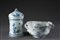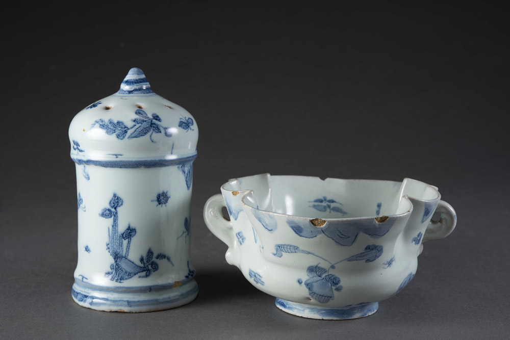 Manifattura ligure del sec. XVIII. Lotto composto da una piccola salsiera ed una saliera in maiolica decorate nei toni del blu (difetti) Lot comprising a small 18th-century majolica sauce boat and salt shaker (defects)