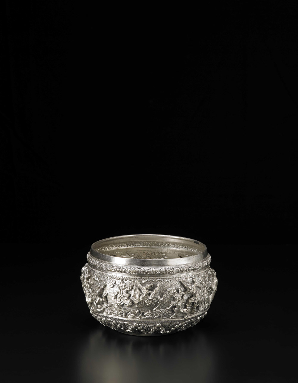 Ciotola in argento stampato, sbalzato e cesellato di forma ottagonale decorata con varie figure e divinità Birmania, XIX/XX secolo A silver bowl richly decorated with various figures and deities Burma, 19th/20th century (diam. cm 18, gr 1880)