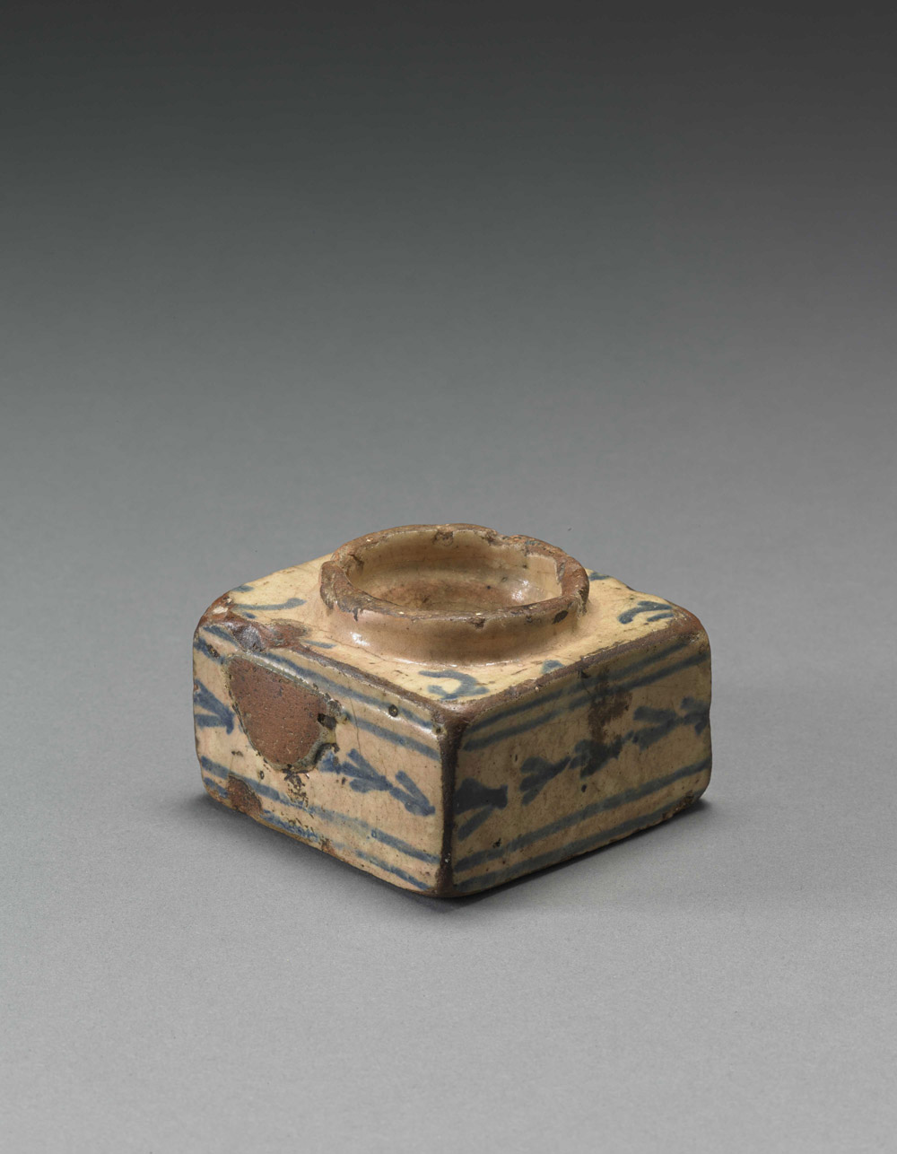 Calamaio quadrato in maiolica ad una vaschetta tonda. Spagna sec XVIII (cm 9x9) (rotture, sbeccature, smalto difettoso) 18th-century Spanish majolica square inkpot (broken, chipped, enamelling defects)