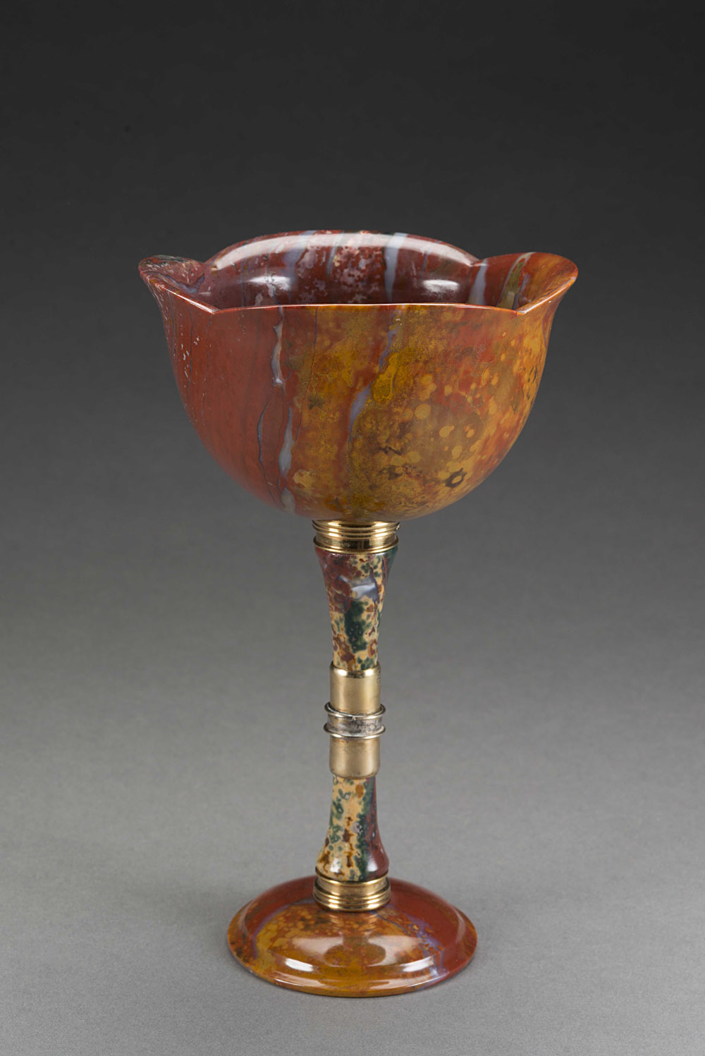Calice in agata di forma mistilinea con ghiere in oro titolo 750. Orefice 665MI (h.cm. 18) Agate goblet with gold rims